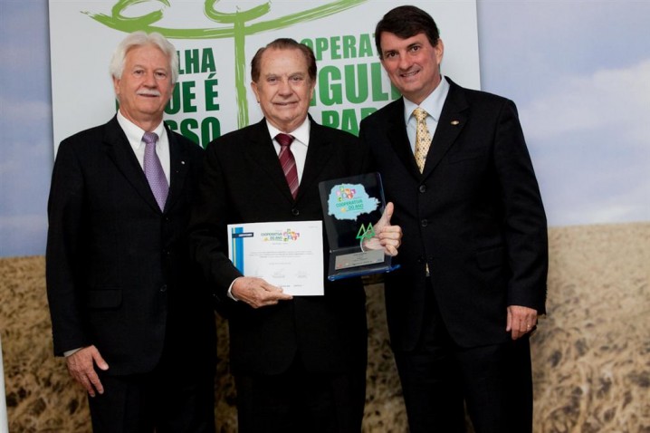 | Gallassini com o prêmio, ladeado por João Paulo Koslowski, presidente da Ocepar e Renato Nobile, superintendente da Organização das Cooperativas do Brasil (OCB) |